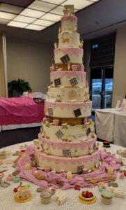 The cake was a 9 tier Princess, decorated with all things edible that it take to make a cake, from rolling pins, cupcakes, piping bags and candles, all created by myself and the members of the CSA and collaboration.